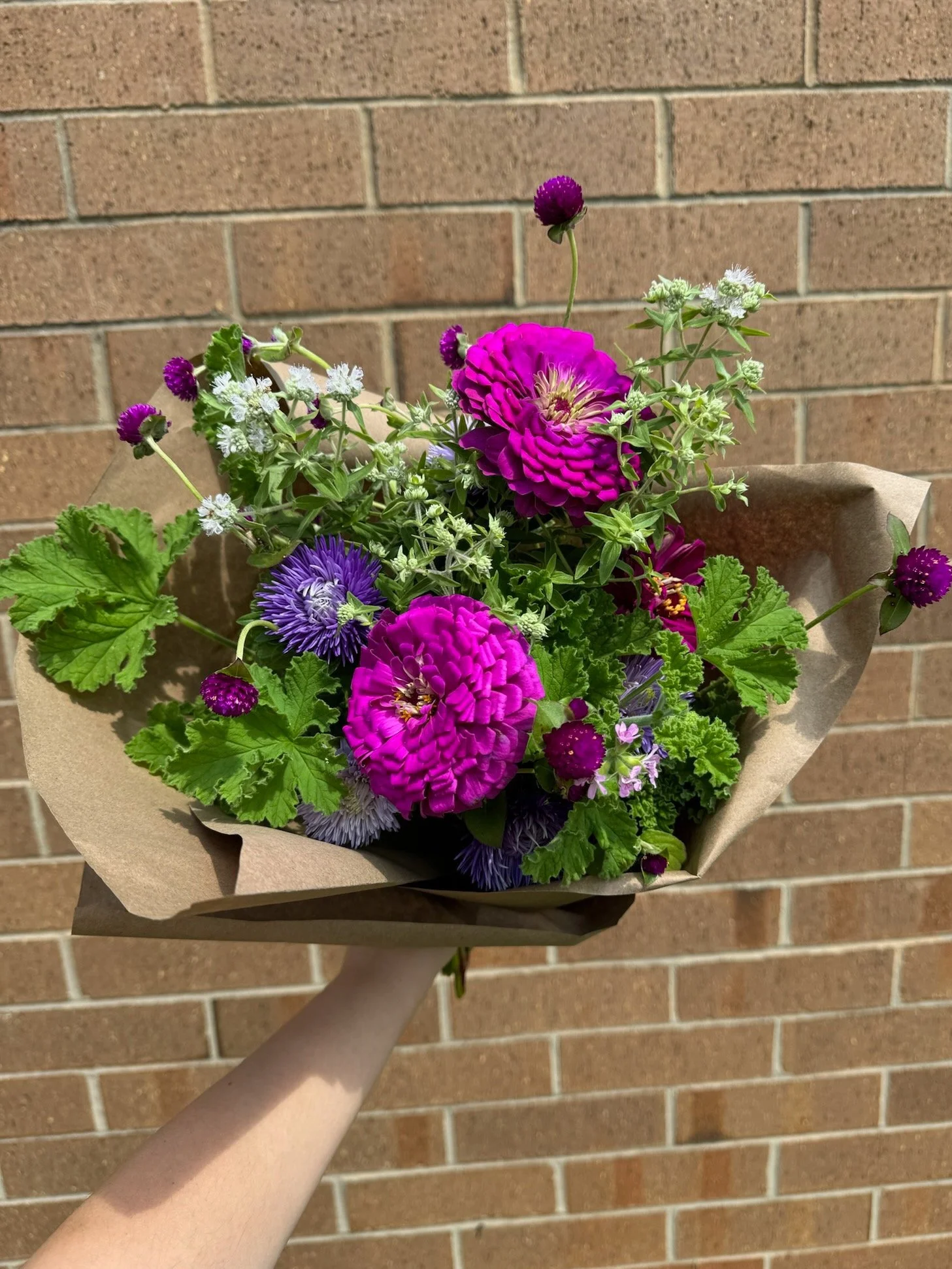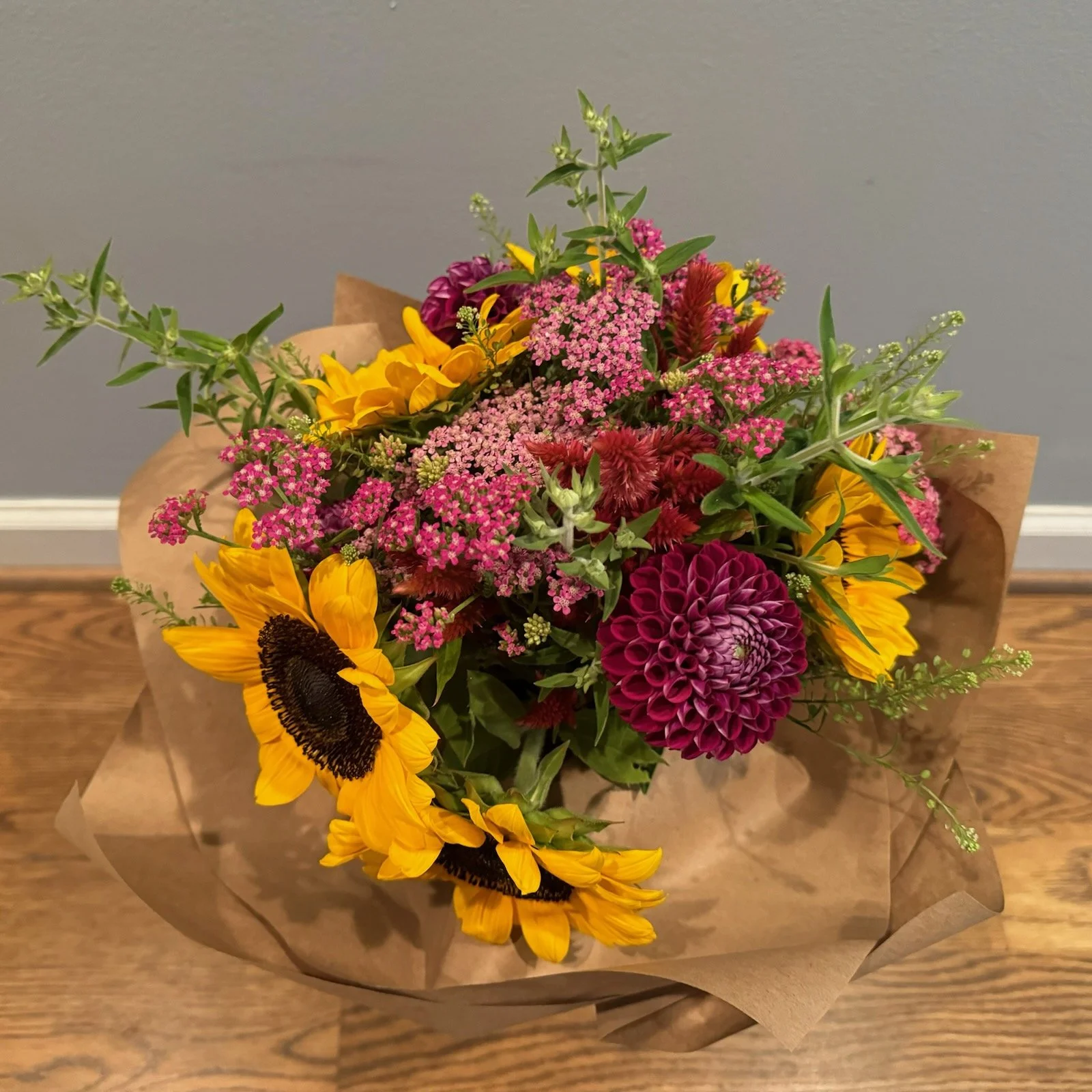 Bouquets include 20-25 stems of gorgeous locally grown blooms carefully wrapped in kraft paper. Depending on availability, summer bouquets may include sunflowers, cosmos, marigolds, zinnias, celosia, etc.